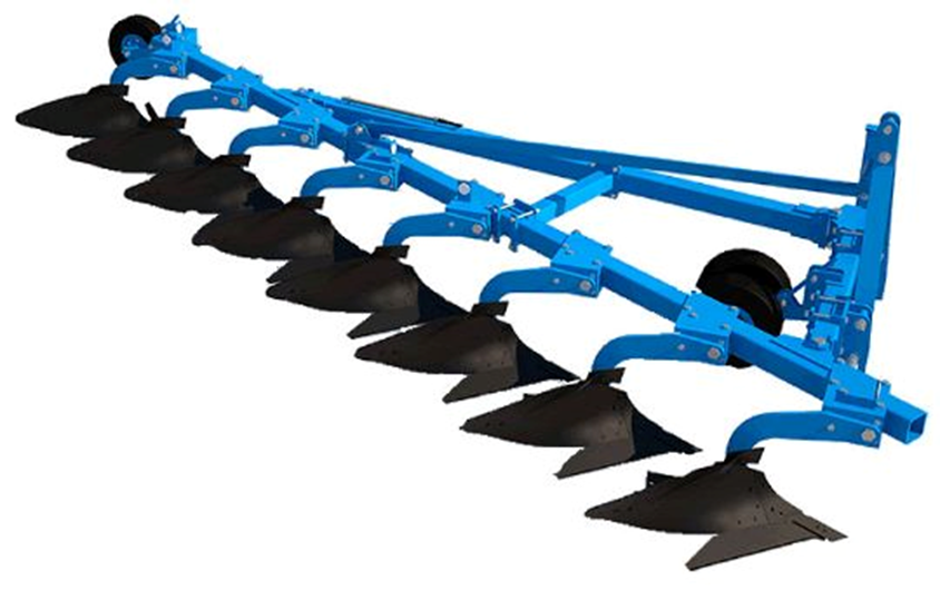 может иметь до 12-13 корпусов по обе стороны от рамы и ширину захвата до 6 м. Оборот рамы происходит с помощью гидроцилиндра, что позволяет работать «незагонным» методом и создавать ровный рельеф поля. Наиболее эффективный и прогрессивный вид сельскохозяйственных плугов.